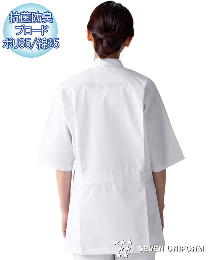 メディカルタイプで男女兼用、薄地の抗菌生地を使用した衛生白衣です。腰ベルトのあるケーシー型で、薬局、美容、給食白衣と幅広く利用されています。左胸/左腰ポケット、背中両脇タック入り。織物生地の《ブロード》は、繊細な横畝が特長の平織物。ポリエステル65%、綿35%。抗菌防臭加工により、食中毒の原因となる黄色ブドウ球菌を抑制、また菌の増殖による悪臭も防止、洗濯を繰り返してもその効果が持続します。