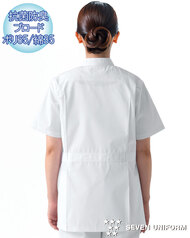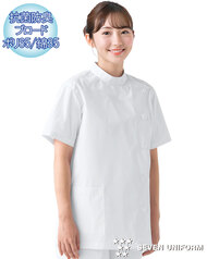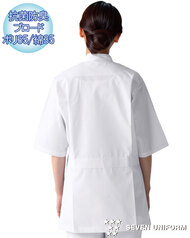 メディカルタイプで女性用、薄地の抗菌生地を使用した衛生白衣です。腰ベルトのあるケーシー型で、薬局、美容、給食白衣と幅広く利用されています。右腰ポケット、動きやすい背中両脇タック入り。織物生地の《ブロード》は、繊細な横畝が特長の平織物。ポリエステル65%、綿35%。抗菌防臭加工により、食中毒の原因となる黄色ブドウ球菌を抑制、また菌の増殖による悪臭も防止、洗濯を繰り返してもその効果が持続します。