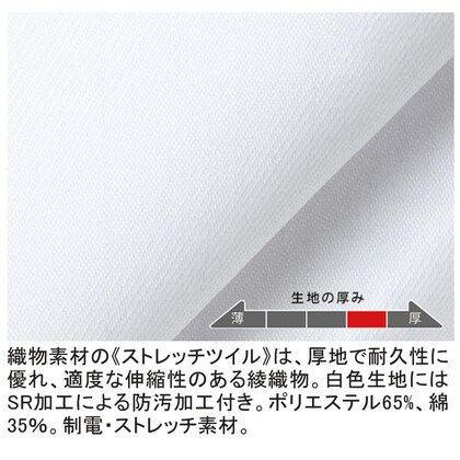しっかりしたストレッチ生地で作られた、UNISEXサービスジャケットです。飲食サービス、コスメ、薬局系など幅広くご利用頂けます。裏地なし、左胸二重ポケット、両腰ポケット付き。織物素材の《ストレッチツイル》は、厚地で耐久性に優れ、適度な伸縮性のある綾織物。洗濯耐久性のあるSR加工を加え、油分を含んだ汚れやアカや黒ずみを洗濯で落としやすく、洗濯後の再汚染も軽減します。制電・ストレッチ素材。
