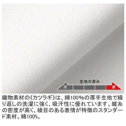 丈夫な厚地、綿100%の調理白衣。男女兼用で着丈はおおよそ膝上丈。袖口は耐久性に優れたゴム、左胸内ポケット、両腰ポケット付き。織物素材の《カツラギ》は、綿100%の厚手生地で繰り返しの洗濯に強く、吸汗性に優れています。縦糸の密度が高く、綾目のある表情が特徴のスタンダード素材。