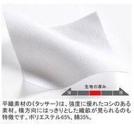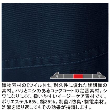 中厚で抗菌制電生地を使用したデザインコックコート。白い樹脂ボタンが爽やかな人気の商品です。ポリエステル高混率ですが綿風合いが豊に感じる素材です。内掛けボタン、内ポケット付き。織物素材の《ツイル》は、耐久性に優れた綾組織の素材。シワになりにくく、扱いやすいイージーケア素材です。ポリエステル65%、綿35%。制菌/防臭・制電素材。洗濯を繰り返してもその効果が持続します。