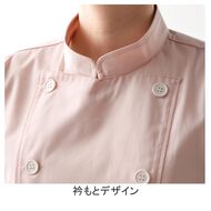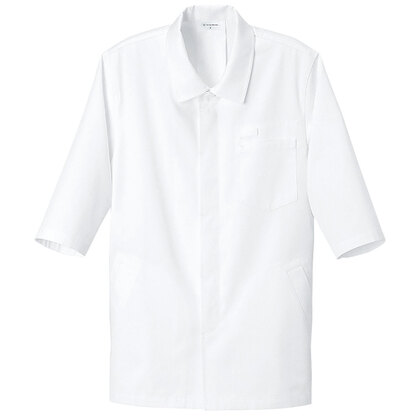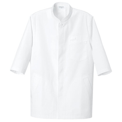 異物混入に配慮した、袖口アンダーカバー付きのスタンドカラー七分袖コートです。左胸/両腰ポケット付き。織物素材の《ナノツイル》は、ナノ単位の加工により、細菌の増殖と悪臭の発生を強力に抑制。水性・油性の汚れもつきにくく、ついた場合も落としやすく加工されています。洗濯を繰り返してもその効果は衰えず、取り扱いも簡単な最先端素材。ポリエステル65%、綿35%。