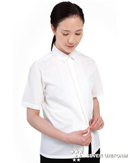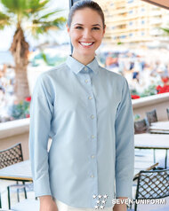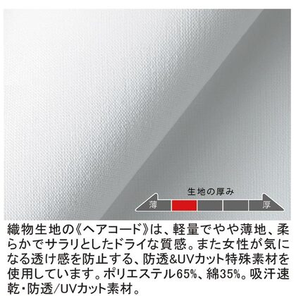 心地よい吸汗速乾と防透性のある素材を使用した、女性用のフォーマルシャツです。シャツの前端を内側に折り込んだ裏前立てに、胸ポケットもないドレッシーな装いが特長。織物生地の《ヘアコード》は、軽量でやや薄地、柔らかでサラリとしたドライな質感。吸汗速乾・防透/UVカット素材。