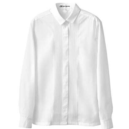 比翼の前立てに沿って裾までプリーツがある女性用のウィングカラーシャツです。タキシードやジャケットと合わせてフォーマルなシーンでのご利用がお勧め。衿後ろ蝶タイループ、織物生地の《ブロード》は、繊細な横畝が特徴の平織物。通気性と耐久性にも優れた素材。