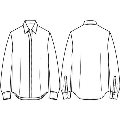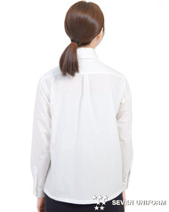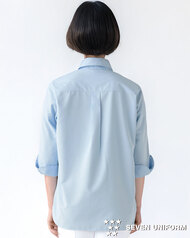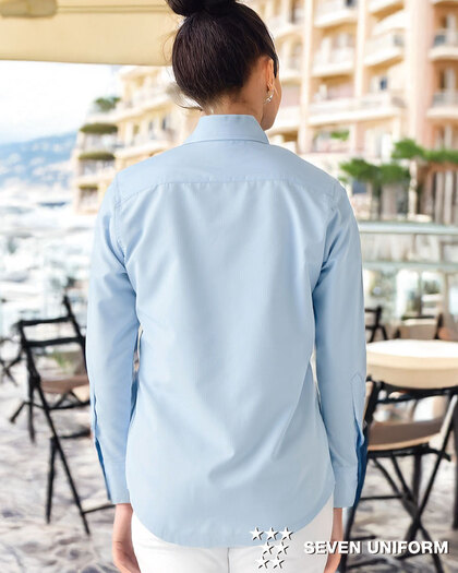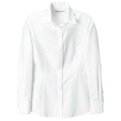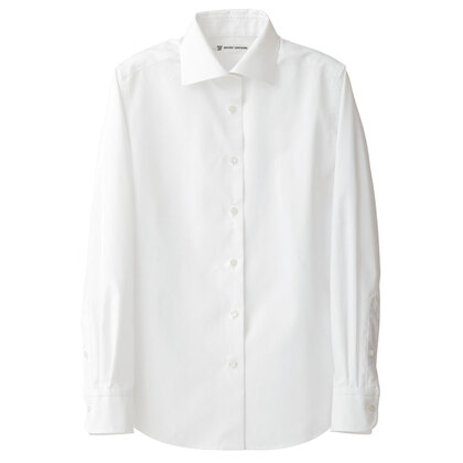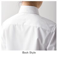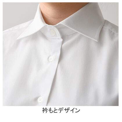 衿もとが形よく開くスキッパーカラーのレディスシャツ。うっすらと斜めの織柄のある上品な生地を使用しています。フロントはボタンの見えない比翼仕様&胸ポケットを省いたスッキリとしたデザインで、正面と背中の両サイドのダーツがウエストラインを綺麗にシェイプしています。織物素材の《カルゼ》は、気になる下着の透けや目立ちを防止する透け防止機能付き。