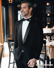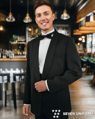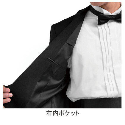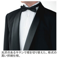 ショールカラーの襟部分に光沢をもたせた、ウール100%の本格のタキシード。ホテル・レストランサービス向けに開発されており、ユニフォームとしての耐久性にも優れ、長くご利用頂ける商品です。内ポケット、小物用ポケット、背抜き仕立て。織物生地の《タキシードクロス》は、タキシードのために特化して織られた高級ウール100%生地。上品な光沢感としなやかな重厚感が特徴です。