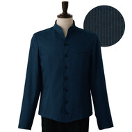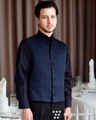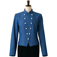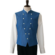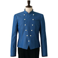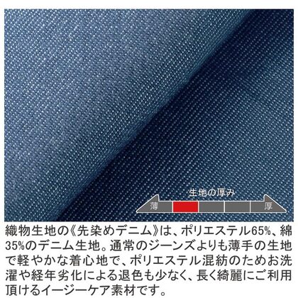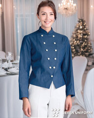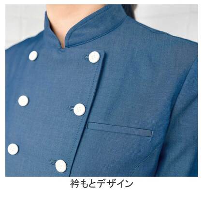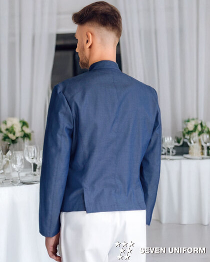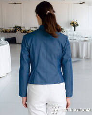 クラシカルなバンケットコートデザインに、カジュアルな雰囲気のポリエステル混デニム素材を組み合わせた、新鮮な一着です。バンケットシーンはもちろん、よりカジュアルなサービスシーンまで幅広く対応。裏地も肩パッドもない軽い仕立てで軽い着用感です。織物生地の《先染めデニム》は、ポリエステル65%、綿35%のデニム生地。ポリエステル混紡のためお洗濯や経年劣化による退色も少なく、長く綺麗にご利用頂けます。