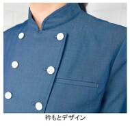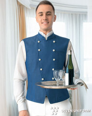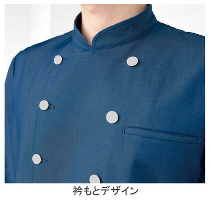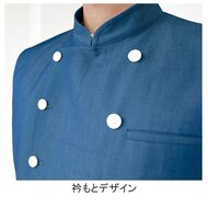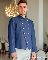 クラシカルなバンケットコートデザインに、カジュアルな雰囲気のポリエステル混デニム素材を組み合わせた、新鮮な一着です。バンケットシーンはもちろん、よりカジュアルなサービスシーンまで幅広く対応。織物生地の《先染めデニム》は、ポリエステル65%、綿35%のデニム生地。通常のジーンズよりも薄手の生地で軽やかな着心地で、ポリエステル混紡のためお洗濯や経年劣化による退色も少なく、長く綺麗にご利用頂ける素材。