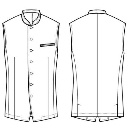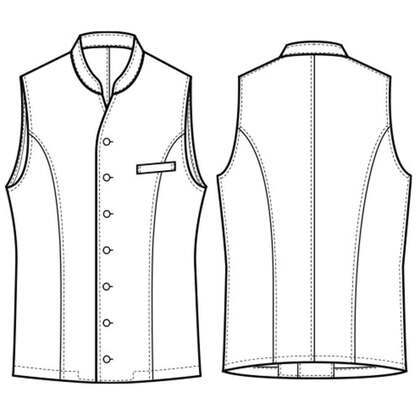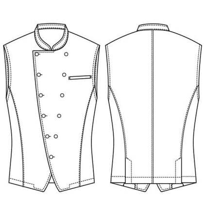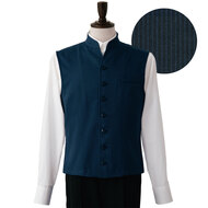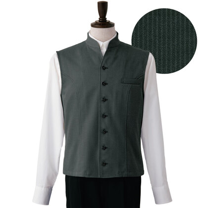 袖なし仕様の男性用バンケットコート。体のラインを綺麗に見せるパターン設計でスッキリと洗練された雰囲気を演出しています。裏地なし。織物素材の《ツイル》は、厚地で耐久性に優れた、シャドーストライプ柄素材。光の加減でストライプが浮かび上がり高級感があります。汚れや黒ずみを洗濯で落としやすいSR加工付き。