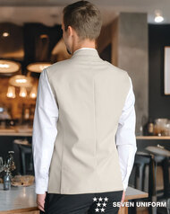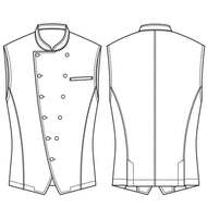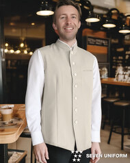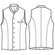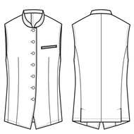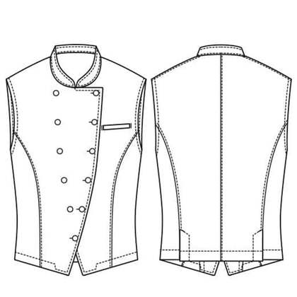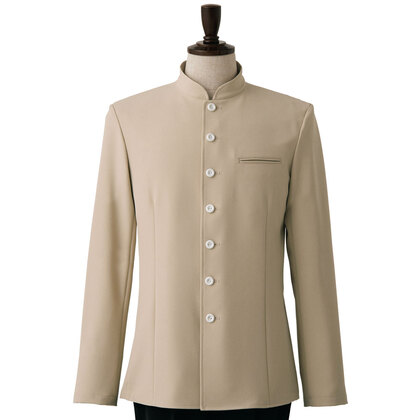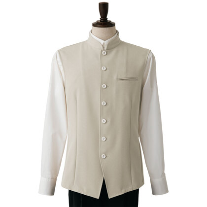 バンケットコートの袖なし仕様として作られた男性用コートです。ポケットはネームプレート用の胸のみ、裏地はなく、洗濯性や耐久性に優れた生地を使用しています。後ろサイドベンツ。織物生地の《ギャバジン》は、ウールスーツ生地のように見える高級感と、洗濯性や耐久性に優れたPremiumな制電素材。伸縮性があり動きにスムーズ、また白色生地には汚れが落としやすいSR加工付き。ポリエステル100%。