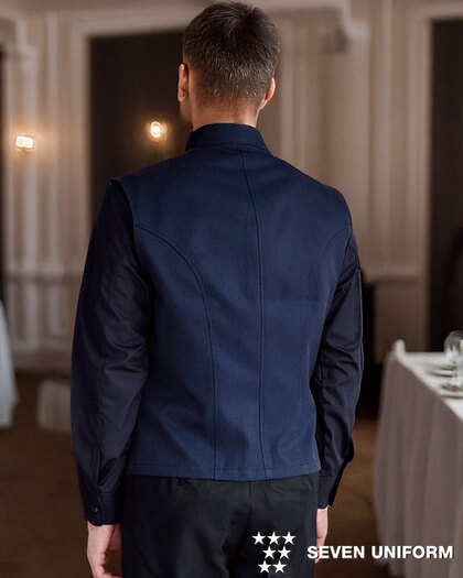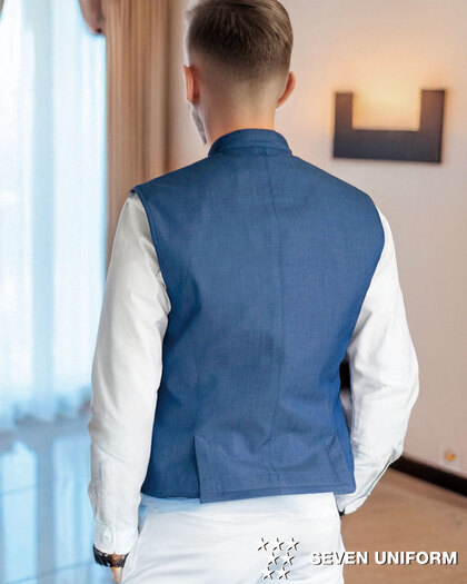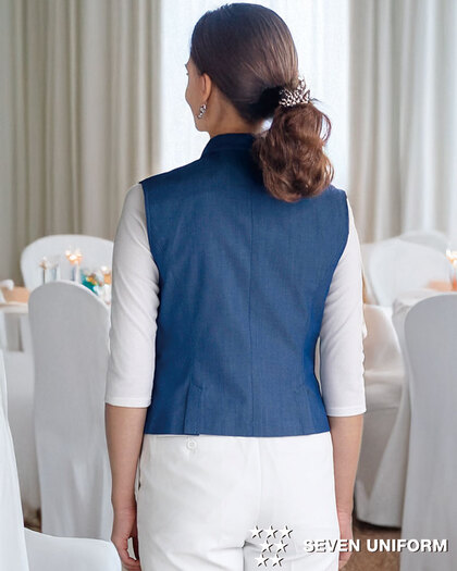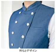 Tシャツにもシャツにも。自由に着こなす新しいサービスベスト。フレンドリーさとおもてなし感、その絶妙なバランスを叶える商品です。織物生地の《先染めデニム》は、ポリエステル65%、綿35%のデニム生地。通常のジーンズよりも薄手の生地で軽やかな着心地で、ポリエステル混紡のためお洗濯や経年劣化による退色も少なく、長く綺麗にご利用頂ける素材。