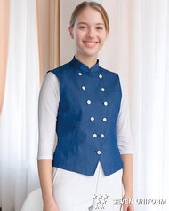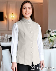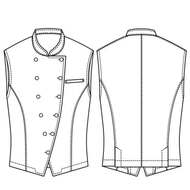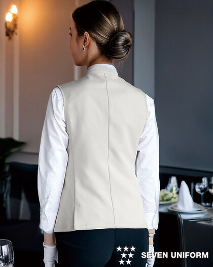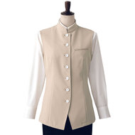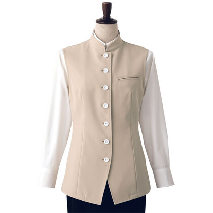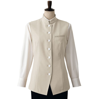 バンケットコートの袖なし仕様として作られた女性用コートです。ポケットはネームプレート用の胸のみ、裏地はなく、洗濯性や耐久性に優れた生地を使用しています。後ろサイドベンツ。織物生地の《ギャバジン》は、ウールスーツ生地のように見える高級感と、洗濯性や耐久性に優れたPremiumな制電素材。伸縮性があり動きにスムーズ、また白色生地には汚れが落としやすいSR加工付き。ポリエステル100%。