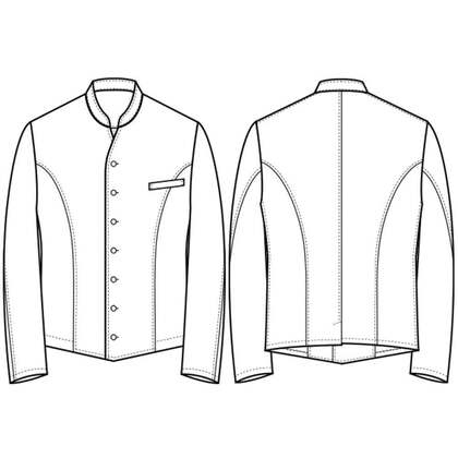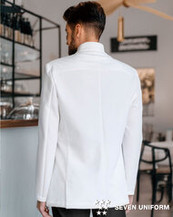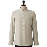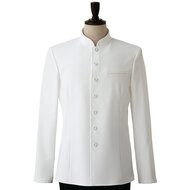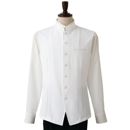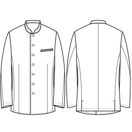 着丈が長め、後ろ姿までシルエットが美しいバンケット仕様の男性用コートです。ポケットはネームプレート用の胸のみ、裏地はなく、洗濯性や耐久性に優れた生地を使用しています。後ろサイドベンツ。織物生地の《ギャバジン》は、ウールスーツ生地のように見える高級感と、洗濯性や耐久性に優れたPremiumな制電素材。伸縮性があり動きにスムーズ、また白色生地には汚れが落としやすいSR加工付き。ポリエステル100%。