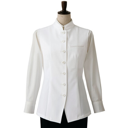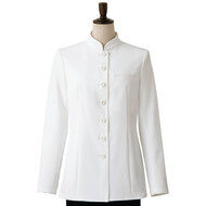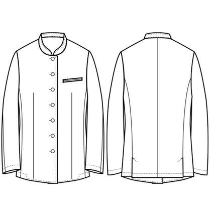着丈が長め、後ろ姿までシルエットが美しいバンケット仕様の女性用コートです。ポケットはネームプレート用の胸のみ、裏地はなく、洗濯性や耐久性に優れた生地を使用しています。後ろサイドベンツ。織物生地の《ギャバジン》は、ウールスーツ生地のように見える高級感と、洗濯性や耐久性に優れたPremiumな制電素材。伸縮性があり動きにスムーズ、また白色生地には汚れが落としやすいSR加工付き。ポリエステル100%。