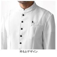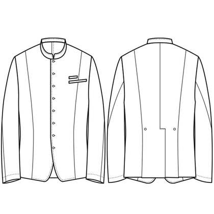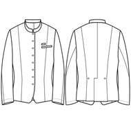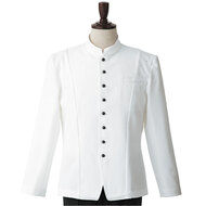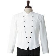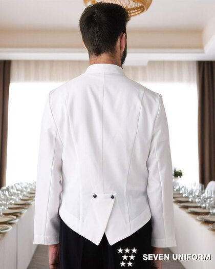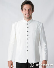 ホテルのバンケットサービスや高級レストランのホールユニフォームとしてご利用頂ける男性用サービスコートです。長め着丈とクラシカルなボタンアクセントが特長。裏地なし仕様。織物生地の《ギャバジン》は、ウールスーツ生地のように見える高級感と、洗濯性や耐久性に優れたPremiumな制電素材。伸縮性があり動きにスムーズ、また白色生地には汚れが落としやすいSR加工付き。
