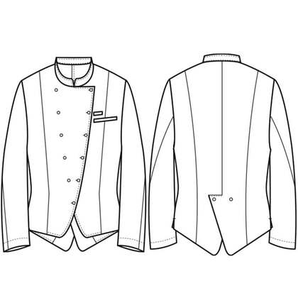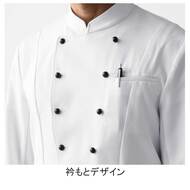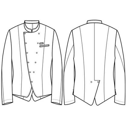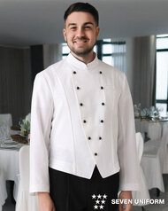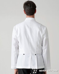 ホテルのバンケットサービスや高級レストランのホールユニフォームとしてご利用頂ける男性用サービスコートです。ダブルの打ち合わせとアクセントボタンが印象的。裏地なし仕様。織物生地の《ギャバジン》は、ウールスーツ生地のように見える高級感と、洗濯性や耐久性に優れたPremiumな制電素材。伸縮性があり動きにスムーズ、また白色生地には汚れが落としやすいSR加工付き。