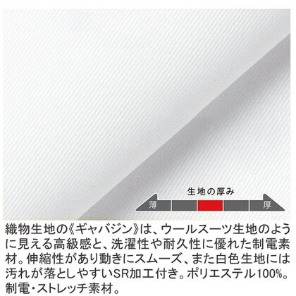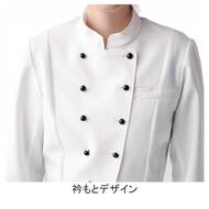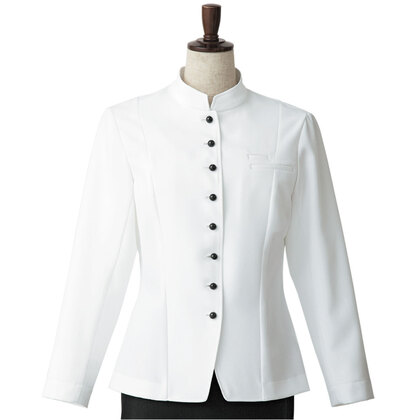 ホテルのバンケットサービスや高級レストランのホールユニフォームとしてご利用頂ける女性用サービスコートです。長め着丈とクラシカルなボタンアクセントが特長。裏地なし仕様。織物生地の《ギャバジン》は、ウールスーツ生地のように見える高級感と、洗濯性や耐久性に優れたPremiumな制電素材。伸縮性があり動きにスムーズ、また白色生地には汚れが落としやすいSR加工付き。