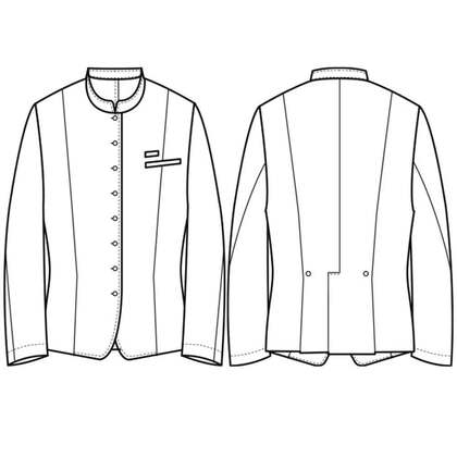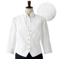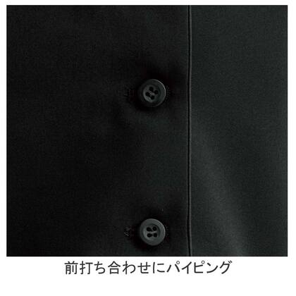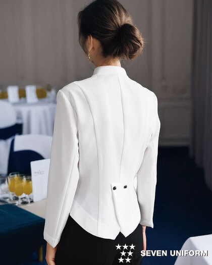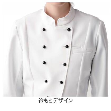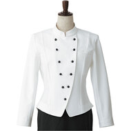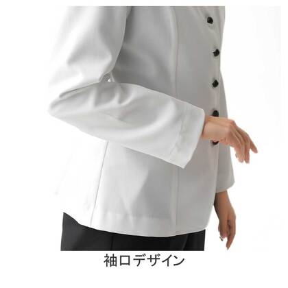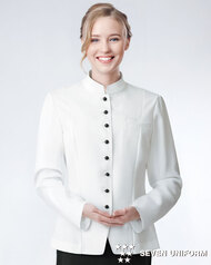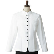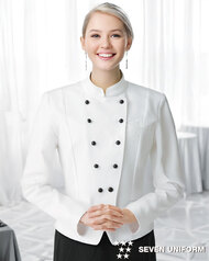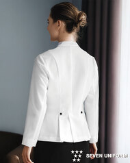 ホテルのバンケットサービスや高級レストランのホールユニフォームとしてご利用頂ける女性用サービスコートです。ダブルの打ち合わせとアクセントボタンが印象的。裏地なし仕様。織物生地の《ギャバジン》は、ウールスーツ生地のように見える高級感と、洗濯性や耐久性に優れたPremiumな制電素材。伸縮性があり動きにスムーズ、また白色生地には汚れが落としやすいSR加工付き。
