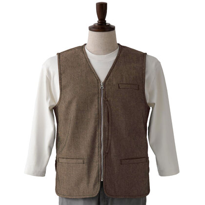 遊び心のあるデザインに、長く使っても色落ちのない麻調のデニム素材が特長のカジュアルベストです。フロントZIP、左胸/両腰ポケット、フロントに大型の縦型ポケット、背中大容量ポケット付き。綾織素材の《麻調デニム》は、空気紡績という方法で糸を作ることにより、麻のような風合いと快適なドライタッチを実現した肌離れの良い素材。ポリエステル65%、綿35%。ストレッチ・制電素材。