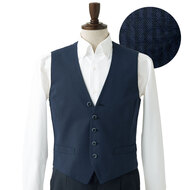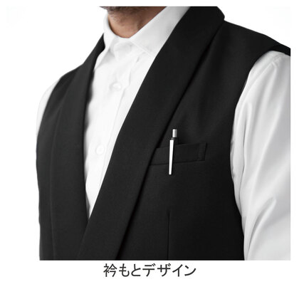 カシミヤ調の柔らかさとビロードのような光沢を持つ高級ドスキン織りで仕立てた男性用ベスト。パイピング仕様で高級感があり、着心地もしっかりとした商品です。ギャルソンのスタイルをイメージしたデザインで、このベストを主役にしたコーディネートがおすすめ。総裏、ウェストに2段の多機能ポケット、背中調整ベルト付き。織物素材の《カシミアドスキン》は、微起毛で上質感のある風合いとしなやかな肌ざわりの高級素材。