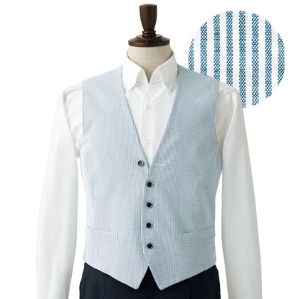 生地表面にシボ感がある、綿混ストレッチ生地を使用したサービスベスト。FOMALの中に小洒落たカジュアル感を感じるデザインです。第一ボタンは開けて着用します。背中バックル付ベルト、総裏仕立て。織物生地の《サッカー》は、涼し気で開放感のある軽量素材。生地表面に凹凸のシボがあり肌の接触面が少なく、通気性があり、べたつきの少ないのも特長です。綿50%、ポリエステル30%、複合素材20%。