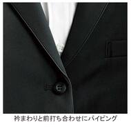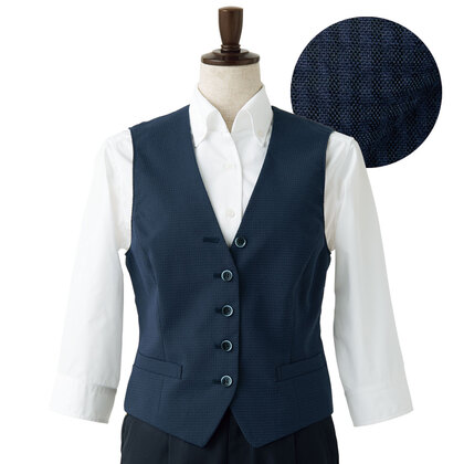 生地表面にシボ感がある、綿混ストレッチ生地を使用した女性用サービスベスト。FOMALの中に小洒落たカジュアル感を感じるデザインです。第一ボタンは開けて着用します。背中バックル付ベルト、総裏仕立て。織物生地の《サッカー》は、涼し気で開放感のある軽量素材。生地表面に凹凸のシボがあり肌の接触面が少なく、通気性があり、べたつきの少ないのも特長です。綿50%、ポリエステル30%、複合素材20%。