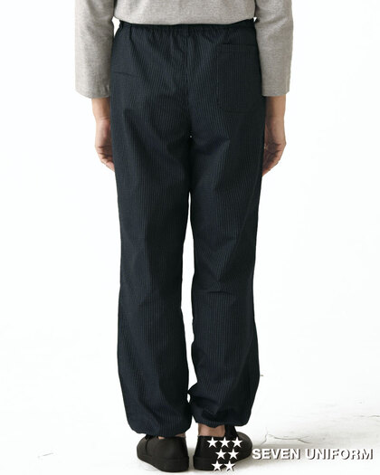 伝統色の藍に先染めのかすれ棒縞柄の作務衣パンツ。ウェスト総ゴム(ひも入り)、両腰/右後ポケット、裾ひも入り。織物生地の《先染め平織》は、藍色ベースに先染めのかすれ棒縞柄をあしらった和素材です。落ち着きと風格のある印象が特長。ポリエステル65%、綿35%。