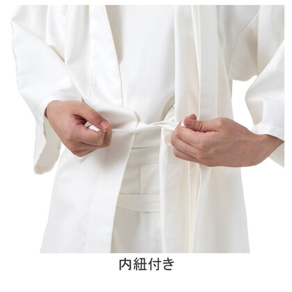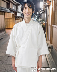 ハッピと若干異なり、袖口を細めに設計してある綿100%葛城素材の作務衣です。調理場から接客まで和食の幅広いシーンで活躍する商品。袖丈は肘下、左腰ポケット付き。織物素材の《カツラギ》は、綿100%の厚手生地で繰り返しの洗濯に強く、吸汗性に優れています。縦糸の密度が高く、綾目のある表情が特徴のスタンダード素材。