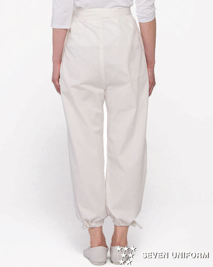 共布の腰ひもで腰周りをぐるりと巻き付ける作務衣パンツ。味のある手作り風の三河木綿を使用しています。ヒップからわたり、筒までゆとりのあるデザイン。ウェスト総ゴム、前ファスナー、両腰/右後ろポケット付き。日本の木綿発祥の地で作り出された良質な綿を70%、耐久性のあるポリエステルを30%混紡した生地を使用、綿高混率ならではの風合いと、心地よい着心地も特長。
