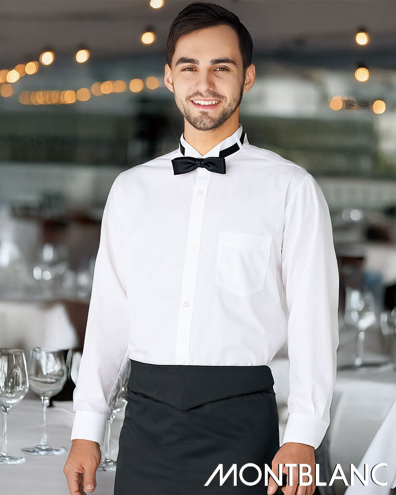 蝶ネクタイループ付きの男女兼用ウィングカラーシャツです。シンプルなデザインとお買い求めやすい価格設定で人気の商品です。織物素材の《ブロード》は、生地面に横畝がある高密度な平織り生地。しなやかな風合と優れた通気性、また洗濯にも強い定番素材です。