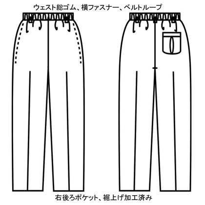 作業のしやすいウェスト総ゴムのレディス仕様コックパンツです。横ファスナー、ベルトループ、右後ろアウトポケット付き。織物生地の《双糸ツイル》は、2本の糸を撚り合わせて1本の糸にした双糸を使用した綾織物。中厚で高い耐久性があり、さらにソフトな肌触りが特徴。制電・グリーン購入法対応再生繊維を使用しています。