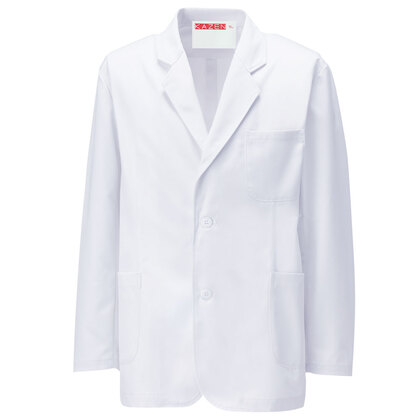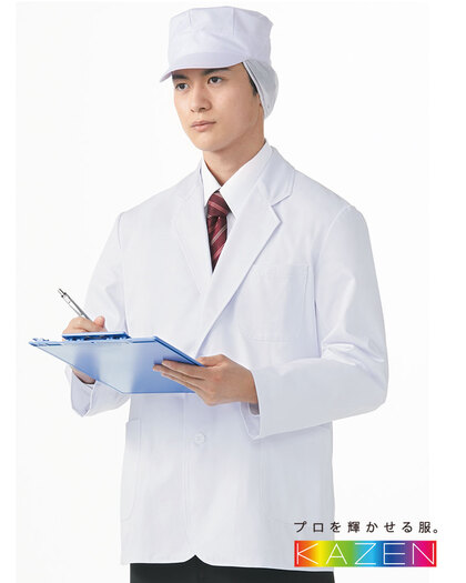 食品売り場のマネージャーさん他にお勧めの、清潔感あるホワイトジャケットです。左胸/両腰ポケット付き。織物素材の《双糸ツイル》は、2本の糸を撚り合わせて1本の糸にした双糸を使用した綾織物。通常の単糸に比べて更にしなやかでハリのある素材感が特徴。SEK(橙)の制菌加工付き。