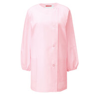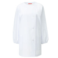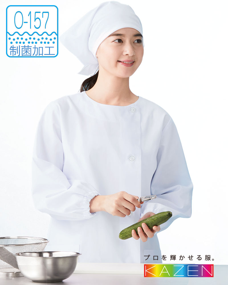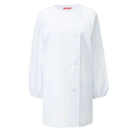 フロントの打ち合わせが横掛けタイプの女性用丸衿長袖調理白衣です。両腰ポケット、袖口ゴム入り。織物素材の《ブロード》は、生地面に横畝がある高密度な平織り生地。しなやかな風合と優れた通気性、また洗濯にも強い定番素材です。O-157に対応した制菌加工付がされています。ポリエステル65%、綿35%。