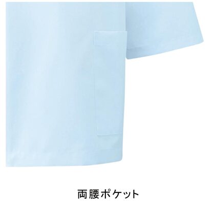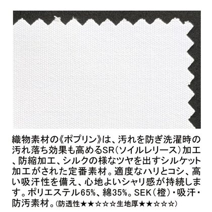 フロントボタン留めの七分袖横掛け白衣です。左胸/両腰ポケット付き。腕の可動を楽にする背中ノーフォーク仕様。織物素材の「ポプリン」は洗濯時の汚れ落ち効果を高めるSR加工に、防縮加工がされた定番素材。適度なハリとコシ、高い吸汗性を備え、心地よいシャリ感が持続します。O-157対応のSEK(橙)・吸汗・防汚・防縮素材。(生地厚★★☆☆☆)