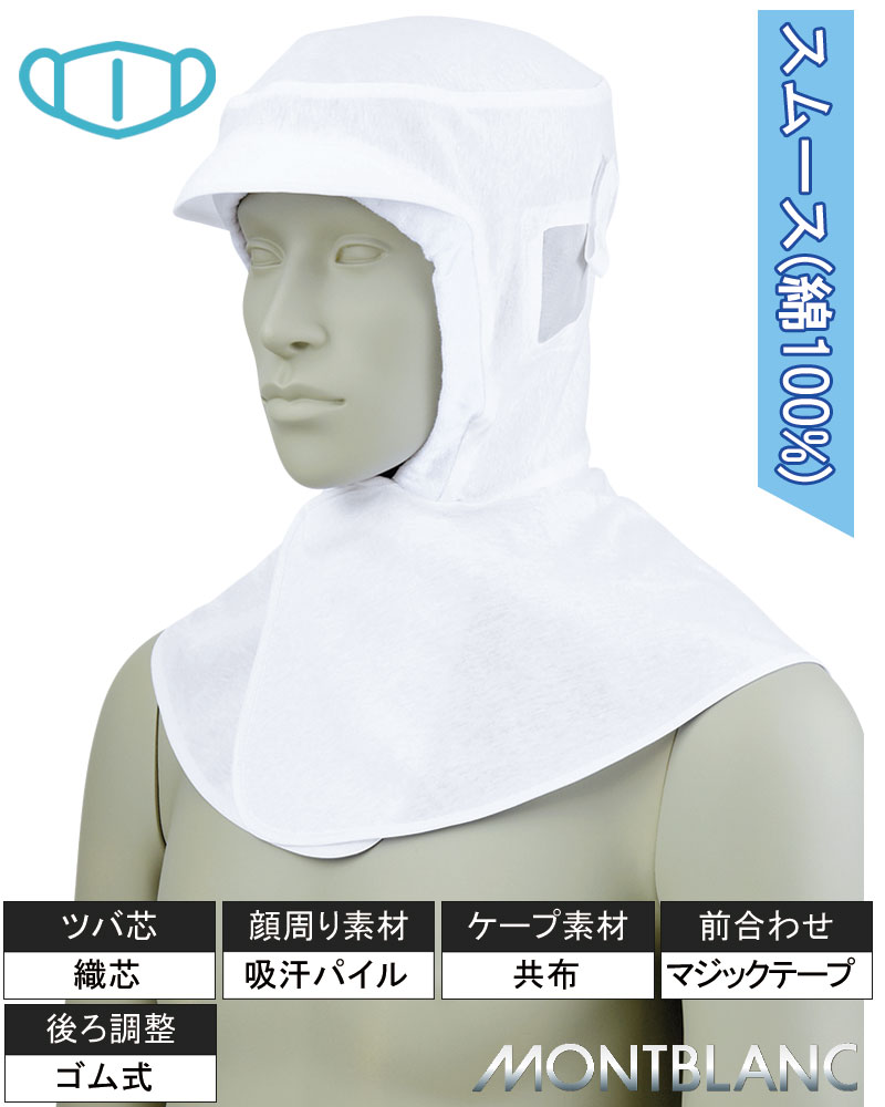 お肌が敏感な方にお勧めの綿100%ロングフードです。音が聞き取りやすい耳メッシュ、ツバ/樹脂芯、顔まわり素材/吸汗パイル、マスク掛け/タブ式、前マジックテープ、後頭部/ゴム式、ケープ素材/共布。ニット素材の《スムース》は、薄手で軽量、肌触りが柔らかで心地の良いストレッチ素材。編み目が均一で非常に滑らか、通気性に優れ、綿ならではの吸汗性にも優れた素材です。敏感肌の方にもお勧めです。