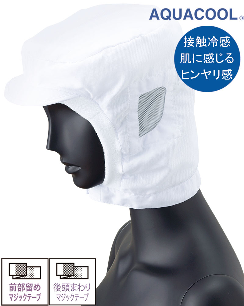 マスク掛けやメガネさしを省いた人気のショートフード。肌に触れるだけでヒンヤリ感のある本体のアクアクール素材をしています。ツバ/織芯、顔まわり素材/パイル、前マジックテープ、後ろ/マジックテープ、耳部/メッシュ(粗目)。