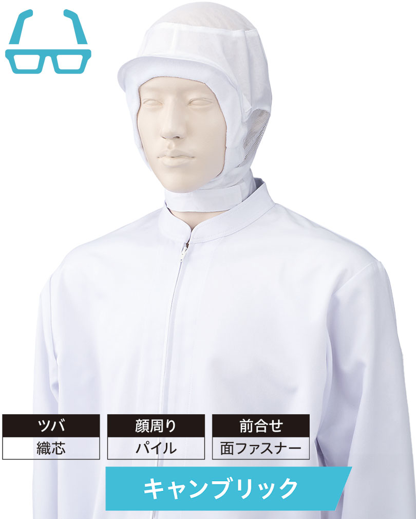ケープなし&天井と耳メッシュ素材のフード帽子です。耐久性と吸汗性に優れた綿100%生地を使用しています。ツバ織芯、顔まわりパイル、メガネをかけても生地が浮かないメガネスリット、前合わせ面ファスナー仕様。
