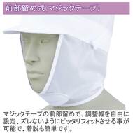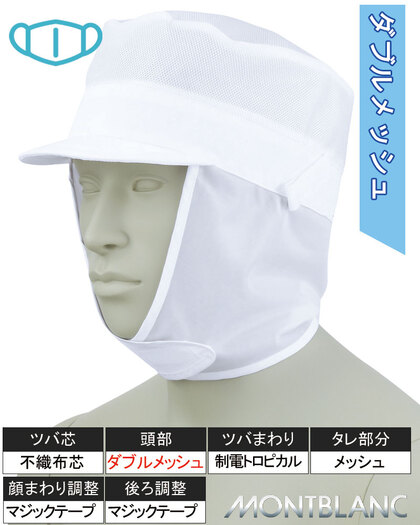 あご下までしっかり留めるメッシュ仕様の丸天帽子。頭まわりに通気性を重視したダブルメッシュを使用しています。ツバ/不織布芯、ツバまわり/制電トロピカル、タレ素材/メッシュ、後ろ調整/マジックテープ。ポリエステル100%です。