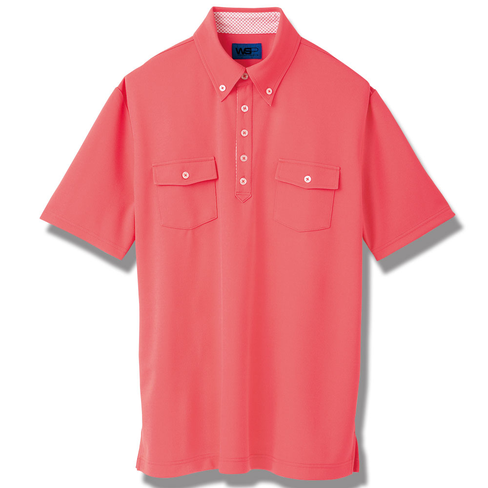 可愛らしいフラップ付きのポケットが付いた、カラバリ豊富な男女兼用半袖ポロ。きっちりした衿元と、ホワイトのアクセントカラーも目を引きます。素材は高級感のあるニット素材で、蒸れやベタつきを押さえた吸汗速乾素材を使用。