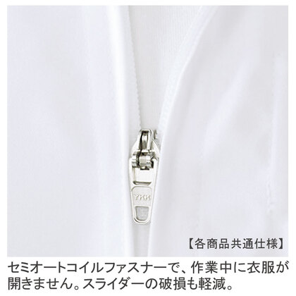 快適性と防シワ性に優れた、やや厚手の制電素材を使用した工場白衣。着丈長め&裾脇ゴムのないコートタイプです。ラグラン袖、腰ネット(スナップ留め)、袖口ネット(ゴム仕様)、ポケットなし仕様。織物素材の《制電交織ツイル》は、汗を素早く吸収拡散する混紡素材と、耐久性と速乾性に優れたポリエステルを組み合わせた綾織組織で、ゴミの付着を防止する制電機能付き。。ポリエステル80%、綿20%。