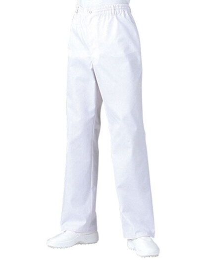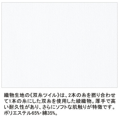 ウェスト総ゴムで圧迫感のない、男女兼用調理用イージーパンツです。フロントファスナー付き、ウェスト総ゴム(ひも入り)、両脇/両後ろポケット付き。織物生地の《双糸ツイル》は、2本の糸を撚り合わせて1本の糸にした双糸を使用した綾織物。厚手で高い耐久性があり、さらにソフトな肌触りが特徴です。