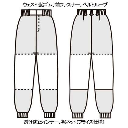 付着した汚れが落ちやすい、呼吸する快適素材で素肌のような心地よさの高機能ホッピングパンツです。ウェスト脇ゴム、前ファスナー、ベルトループ、裾口フライス、裾口ネット、透け防止裏地メッシュ、ポケットなし仕様。織物素材の《ストレッチドビー》は、付着した汚れが落ちやすく、サラッとした点接触の吸汗速乾、吸放湿性にも優れた快適素材。透け防止、高防塵、高制電、SEK(橙)制菌、ポリエステル100%。