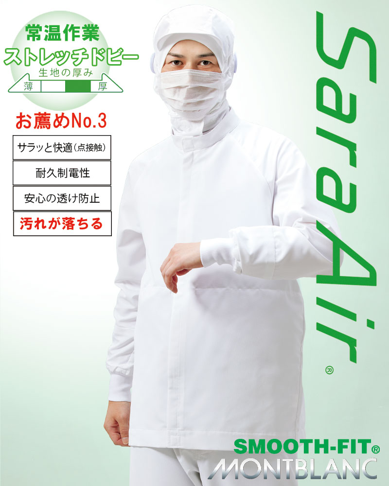 付着した汚れが落ちやすい、呼吸する快適素材で素肌のような心地よさ、帯電防止や透け防止の効果もある高機能。着丈長め&裾脇ゴムのないコートタイプです。作業効率を上げるSmooth-Fitの新次元の動きやすさと、ワンサイズで広範囲のサイズをカバーすることで在庫管理を大きく改善する商品です。ラグラン袖、パイピング縫製、腰ネット(スナップ留め)、袖口ネット、ポケットなし仕様。ポリエステル100%。