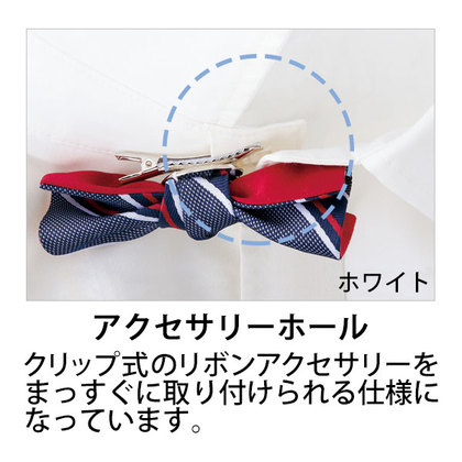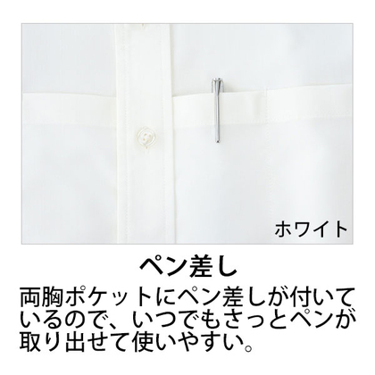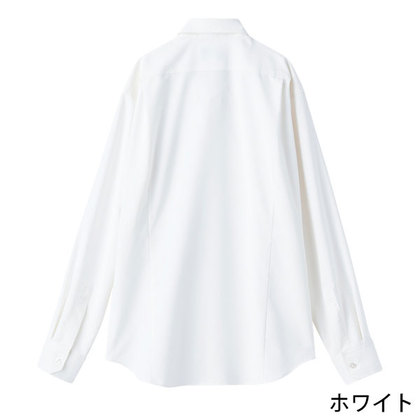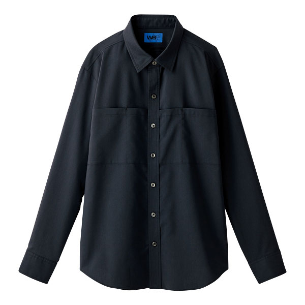 小ぶりの衿に、上質なストレッチ素材を使用したスラリとしたシルエットの男女兼用長袖シャツ。胸元ポケットが左右に大きくデザインされ、首元はクリップ式リボンが取り付けられるホール付き。ストレッチ、吸汗速乾、透け防止、制電防止の機能性素材を使用しています。