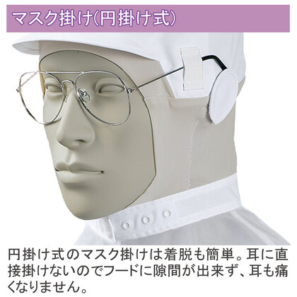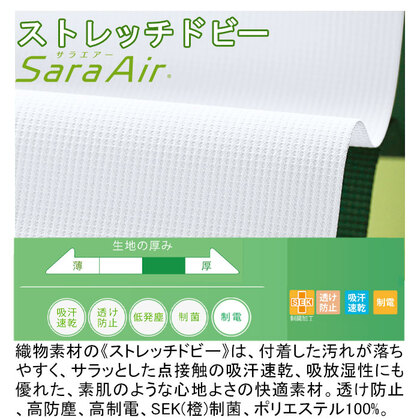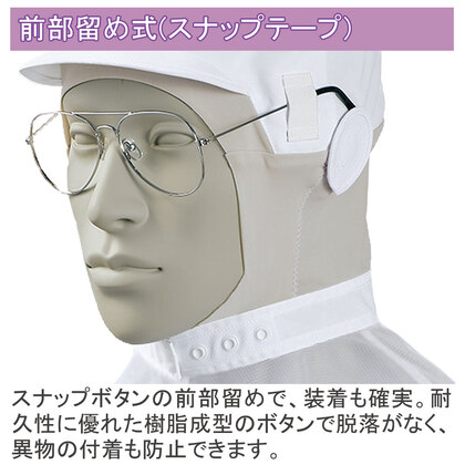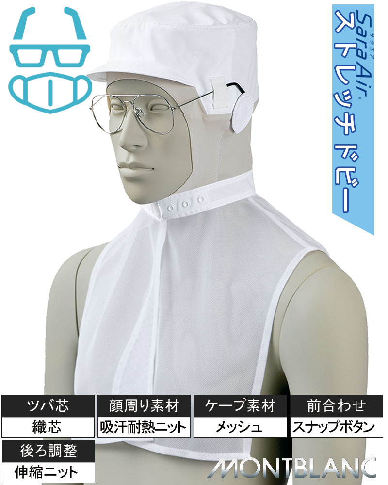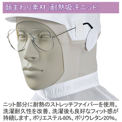 素肌のような心地よさのロングフードです。ツバ/織芯、顔まわり素材/吸汗耐熱ニット、メガネさし/ループ式、マスク掛け/円掛け式、前スナップテープ、後頭部/伸縮ニット、ケープ素材/メッシュ。織物素材の《ストレッチドビー》は、付着した汚れが落ちやすく、サラッとした点接触の吸汗速乾、吸放湿性にも優れた、素肌のような心地よさの快適素材。透け防止、高防塵、高制電、SEK(橙)制菌仕様。