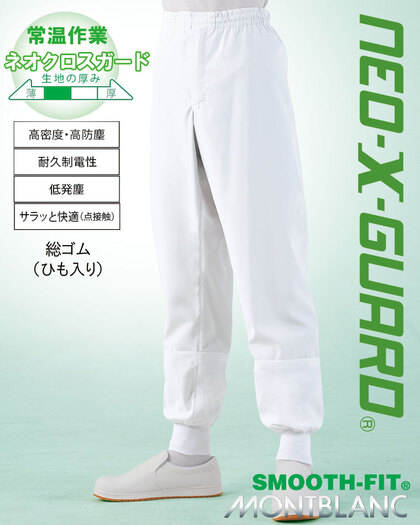 粉ものを扱う作業にお薦め! 毛髪・チリ・ホコリの付着をトリプル効果で抑える高機能ホッピングパンツです。ウェスト総ゴム(ひも入り)、前ファスナー、裾口フライス、裾口ネット、透け防止裏地メッシュ、ポケットなし仕様。織物素材の《ネオクロスガード》は、低発塵で防塵の吸汗速乾素材。肌触りも点接触でサラリと快適。透け防止、低発塵、制電、SEK(橙)制菌仕様。ポリエステル100%。