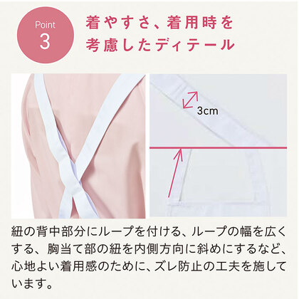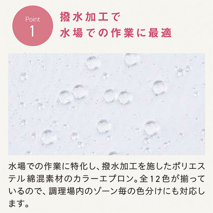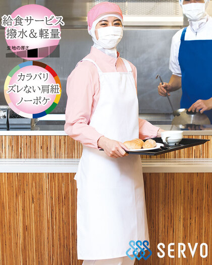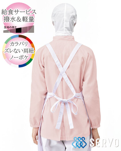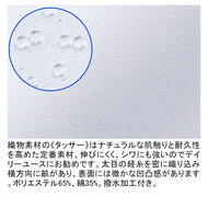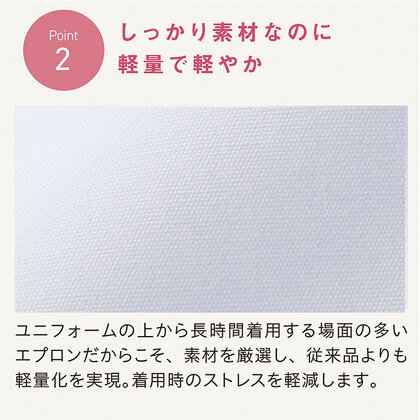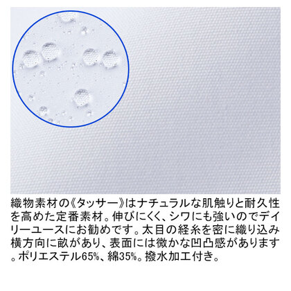 給食サービスや食品加工にお勧めの、撥水&ノーポケットエプロン。後ろX型(肩紐がずれないループ付き)、正面の肩紐の角度を内側向きに斜めにすることで安定感が増しています。織物素材の《タッサー》はナチュラルな肌触りと耐久性を高めた定番素材。伸びにくく、シワにも強いのでデイリーユースにお勧めです。ポリエステル65%、綿35%。撥水加工付き。