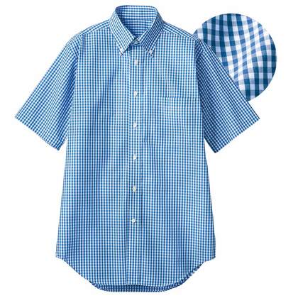 お店の雰囲気を明るくPOPに演出するチェック柄、男女兼用のボタンダウン半袖シャツです。織物素材の《先染めギンガム》は、染色した糸でチェック柄を織りなした、肌触りの良い平織素材。通気性と吸湿性に優れ、取り扱いも簡単なイージーケア素材。形態安定素材。