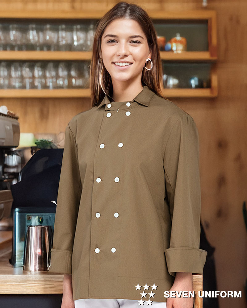 可愛らしいダブルボタンのサービスコート。細身に見えるスタイリッシュなフォルムで後ろ姿も綺麗な商品。袖口/両裾スリット、背中には腕の動きがつっぱらないアクションプリーツ仕様♪ 織物素材の《ポプリン》は、ポプリンは経糸に細糸&緯糸に太目の糸で経糸の密度を緻密にした織物。新品時は生地が硬く感じられますが、着こなしていくうちに体に馴染んでいく商品です。