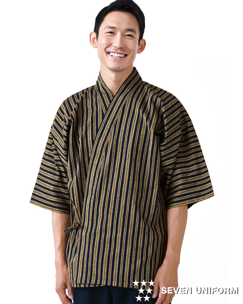 素朴で田舎風、土佐の伝統織物を使用した味わいのある男性用法被コートです。ユニフォームには珍しい綿100%ですが、しっかりとした生地でノーアイロンでも比較的綺麗に着用可能な商品です。左胸内ポケット、両腰ポケット、両裾スリット入り。織物素材の《土佐紬》は、独特の沈んだ色調と風合いで、素朴でなつかしさを感じさせる希少価値のある伝統織物。